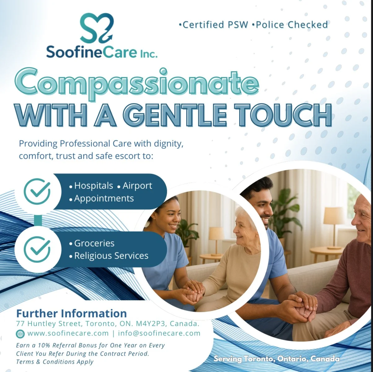 At SoofineCare Inc., we make it easy to connect with professional, compassionate, and certified PSWs for your personal care and escort needs.
